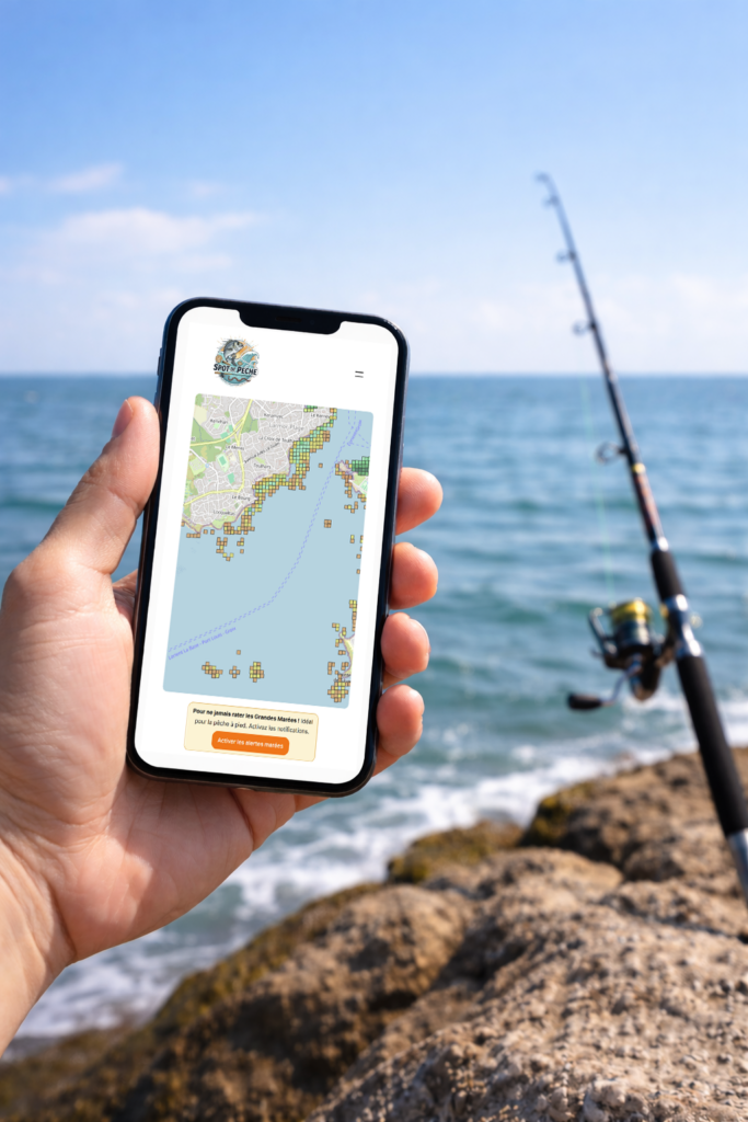 Les spots sont générés par un algorithme propriétaire qui croise plus de 40 données : nature des sédiments marins, bathymétrie, images satellites haute résolution des estrans découvrants, dynamiques de courant et de marée, accessibilité terrain. Chaque spot est ensuite vérifié ou validé par l’équipe — deux pêcheurs bretons avec plusieurs années de terrain sur bar, dorade et pêche à pied. Les retours de la communauté abonnée sont intégrés après vérification.